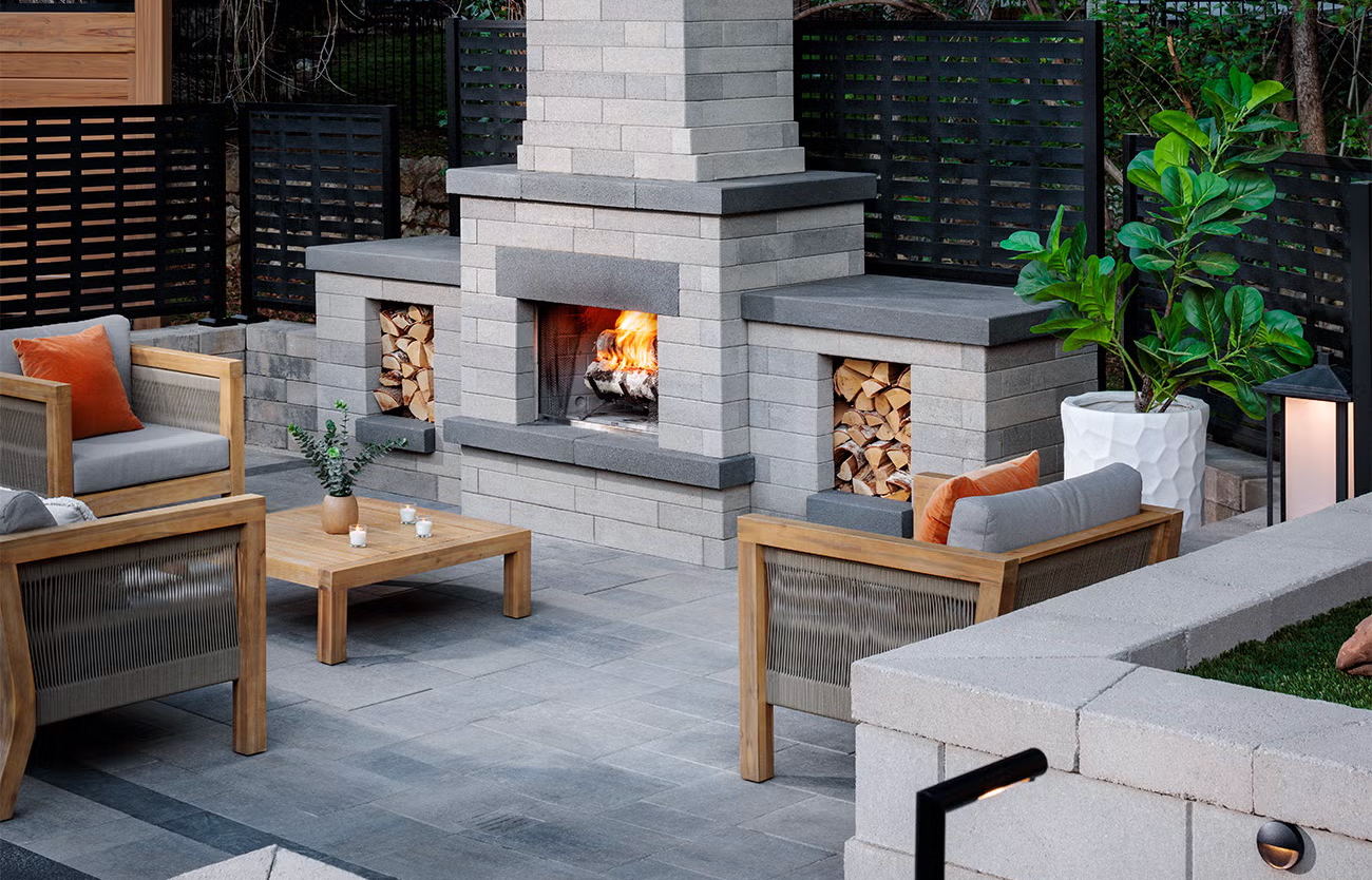 Elevate your outdoor living space with the sleek and modern Melville™ Series Fireplace by Belgard. This fireplace...